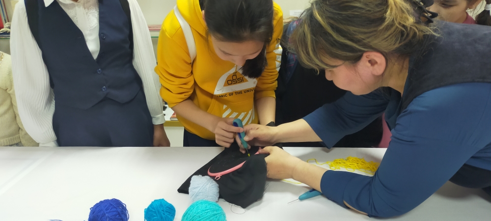 Шарамыздың қонағы қөлөнер шебері Саимова Асель Карасаевна қолдан сөмке тоқужан, және мектептен тыс білім беру орталығының "Жас суретшілер" үйірмесінің жетекшісі Дүйсенова Айнаш Есентүгелқызы кесте тоқыдан өздерінің тәжірибелерімен бөлісті.